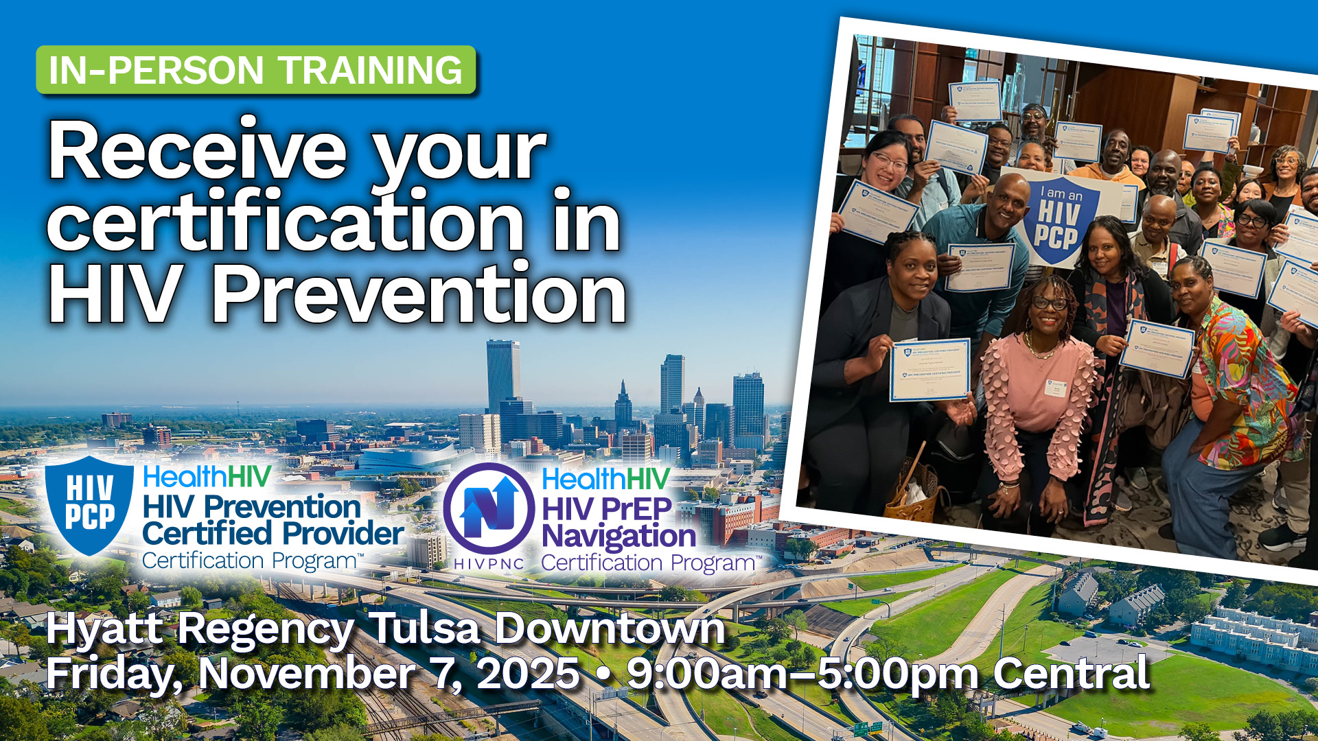 Join us at the Hyatt Regency Tulsa Downtown, where you’ll have the opportunity to earn your free HIV prevention certification! Attend the in-person, interactive training and earn the HIV Prevention Certified Provider™ (HIVPCP) Certification or the HIV PrEP Navigation™ Certification (HIVPNC) on Friday, November 7th.