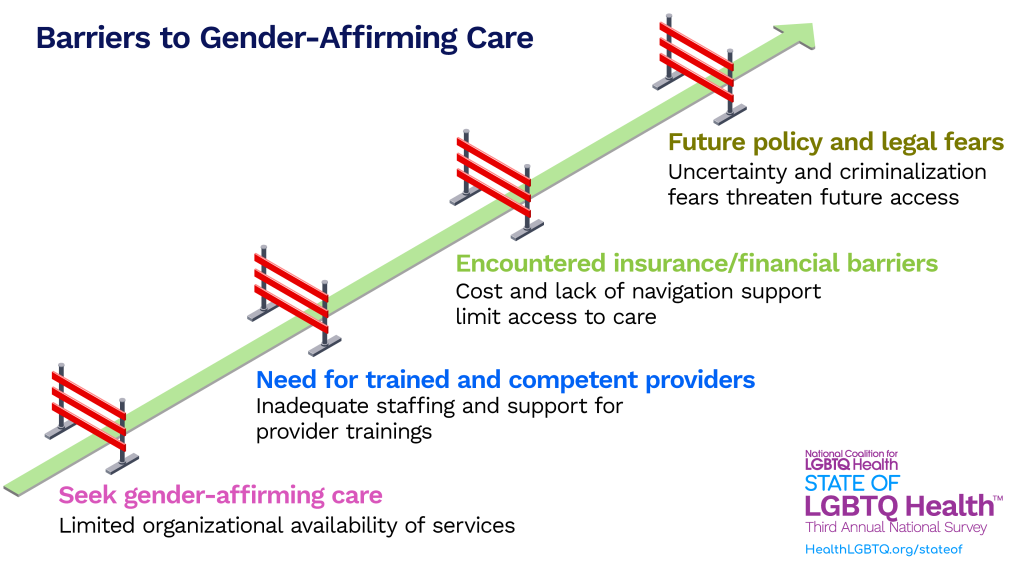 Individuals seeking gender-affirming care encounter intersecting clinical, structural, and policy barriers that collectively impede access. Limited provider capacity, inadequate insurance coverage, and restrictive legislation compound to disrupt continuity of care and delay essential services. Addressing these multi-level challenges in an integrated manner is critical to advancing equitable and comprehensive gender-affirming care.