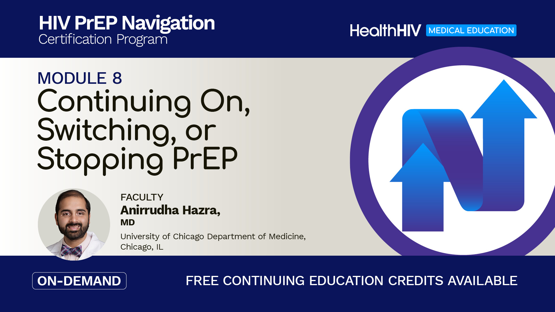 Module 8 of the HealthHIV HIV PrEP Navigation Certification (HIVPNC) Program. This module describes routine PrEP care screenings and strategies to support adherence, manage missed doses or refills, and stop PrEP safely.